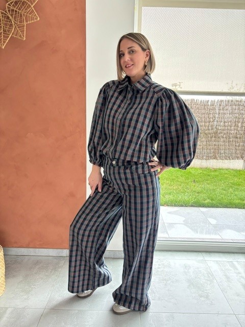 Chemise vichy de couleur bleu marine, orange et rose avec manches bouffantes
