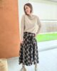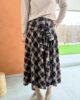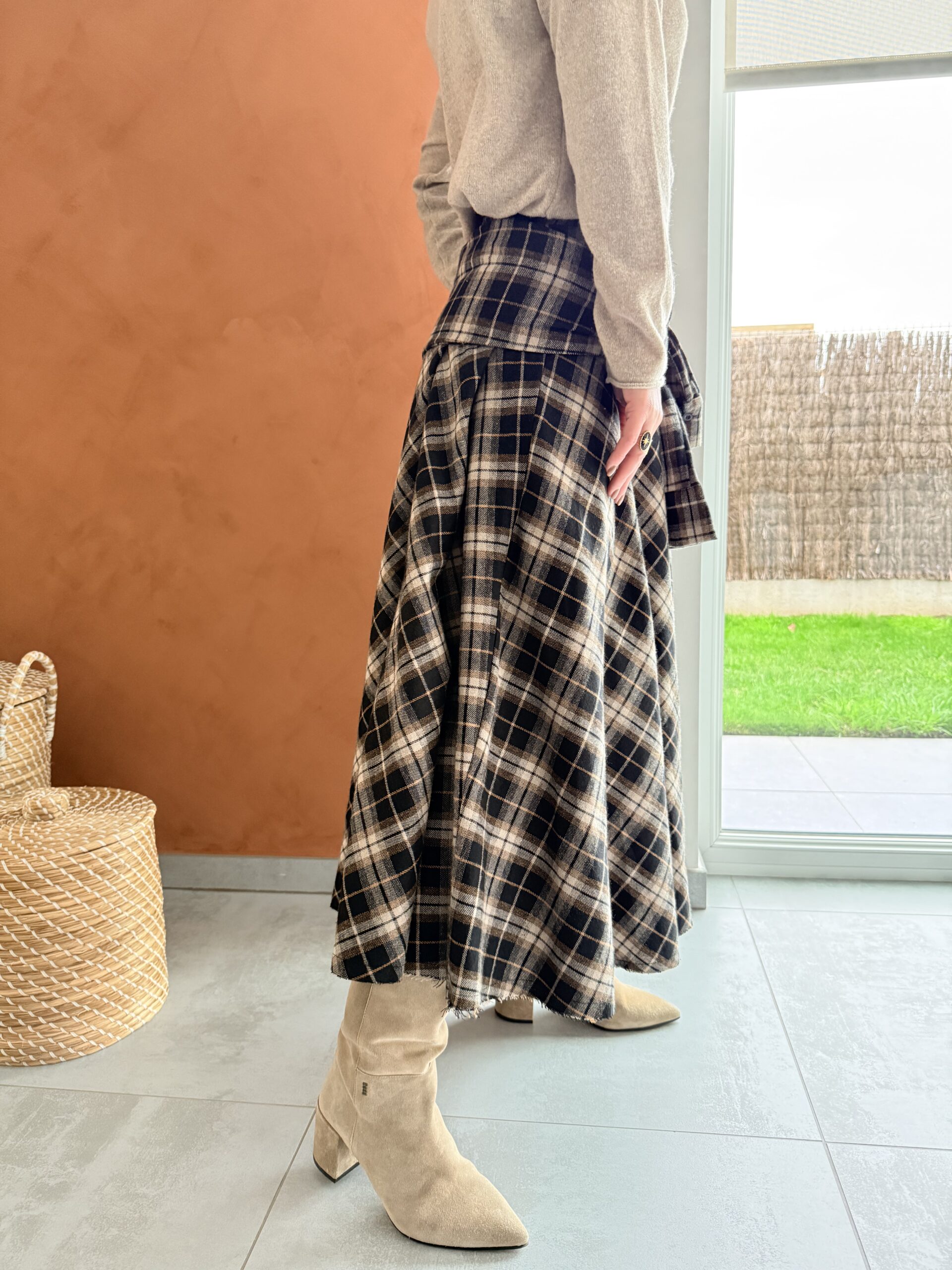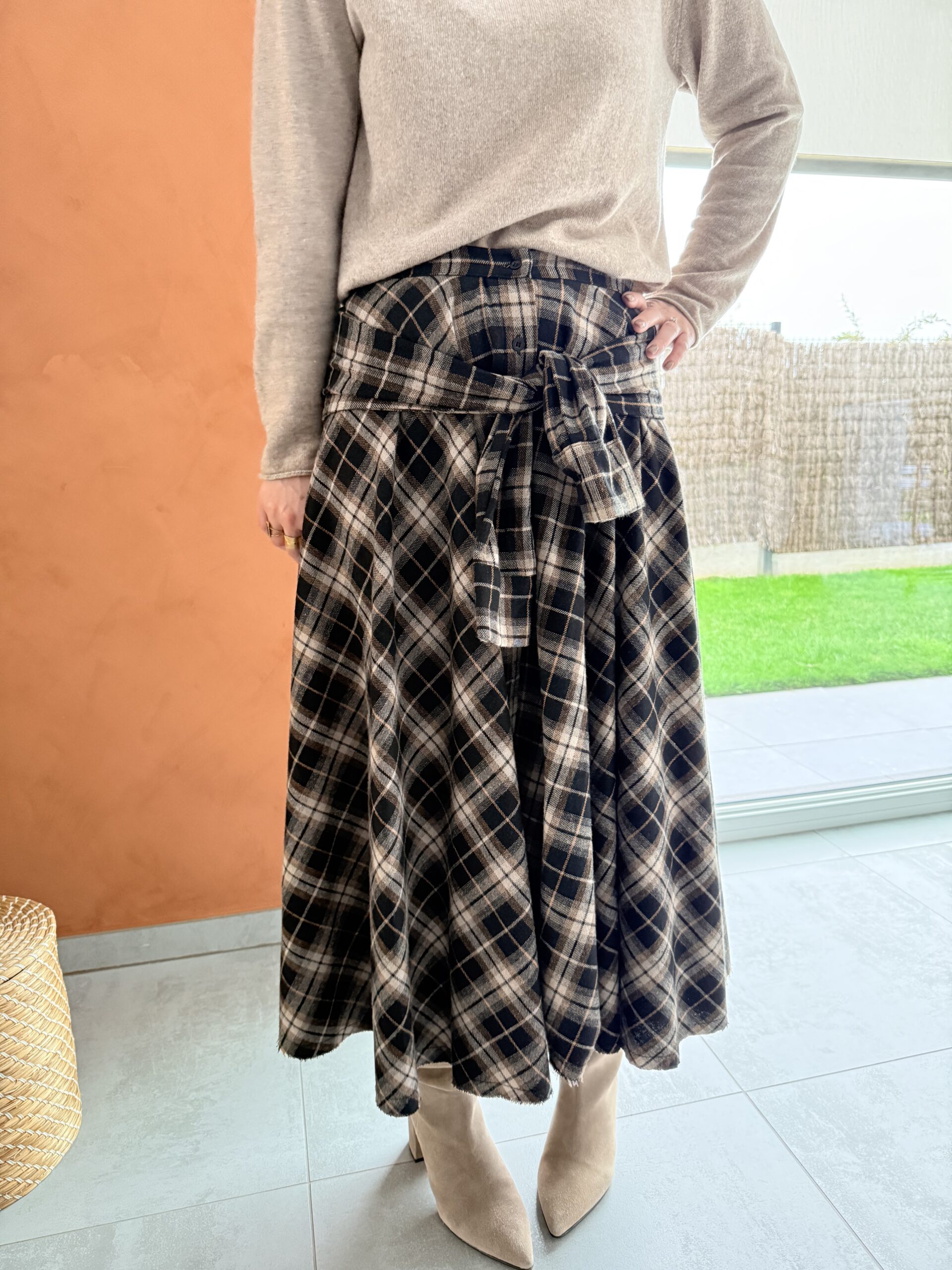 Jupe longue noire à carreaux, ceinture manche de chemisier