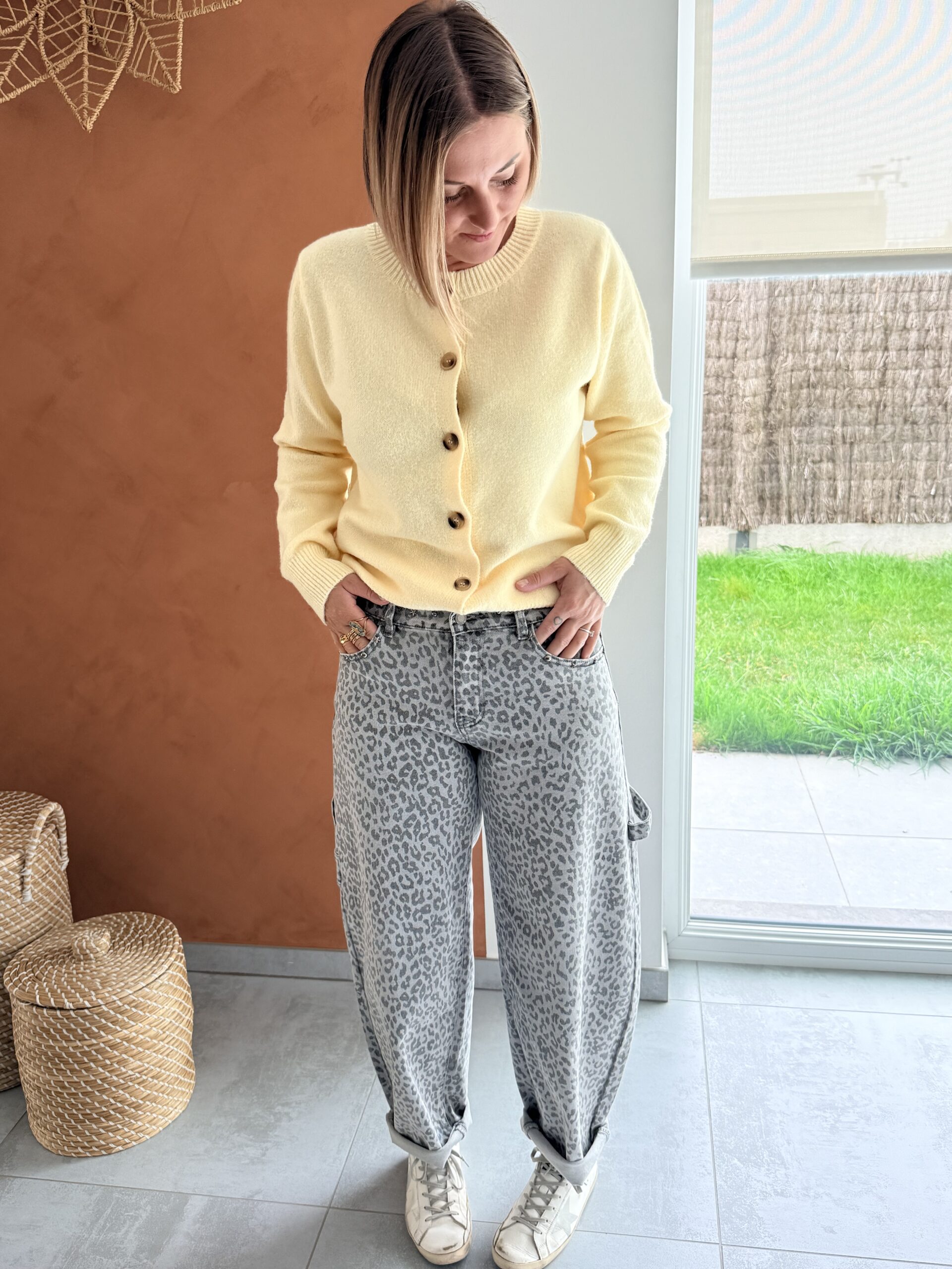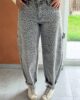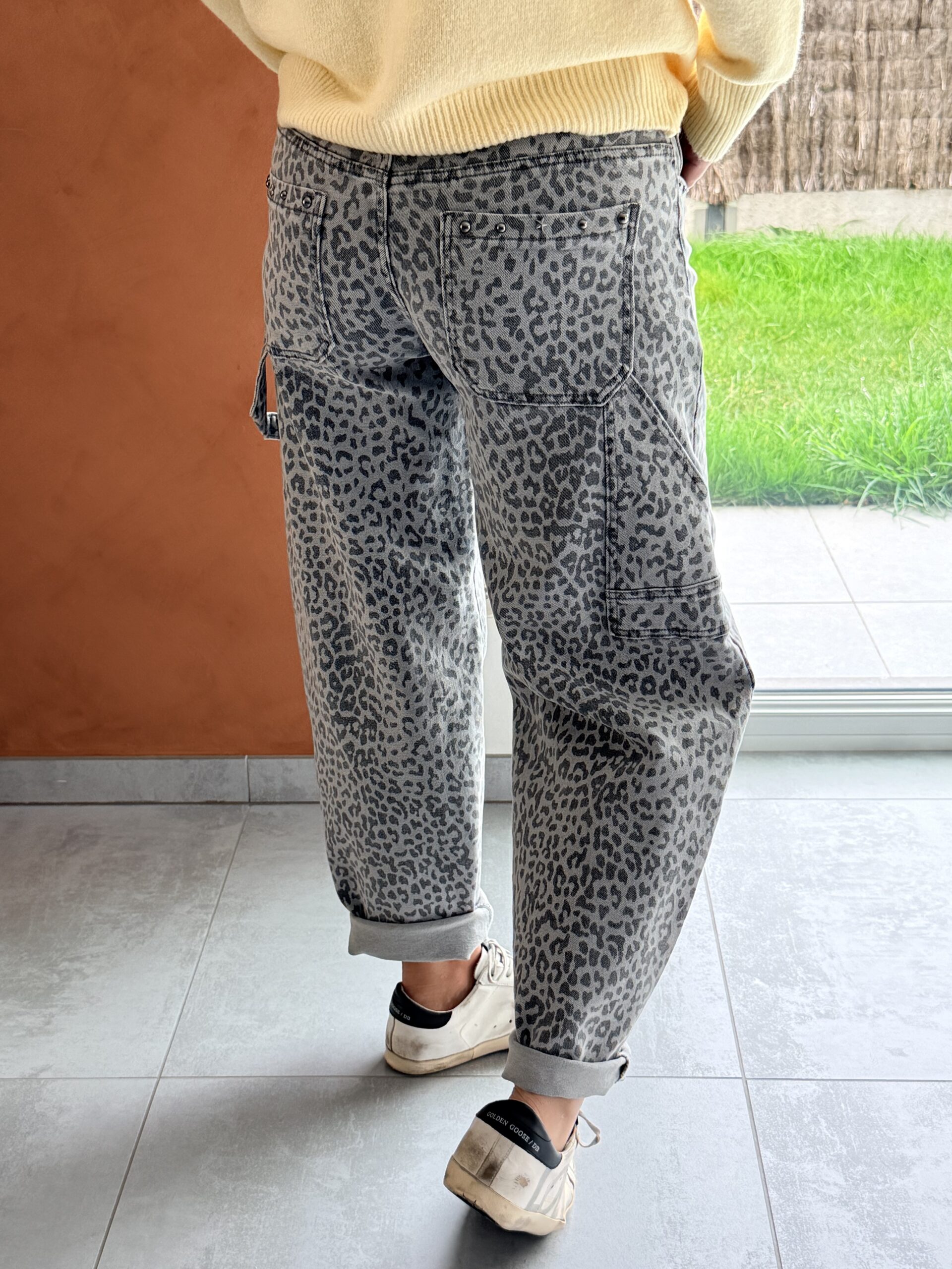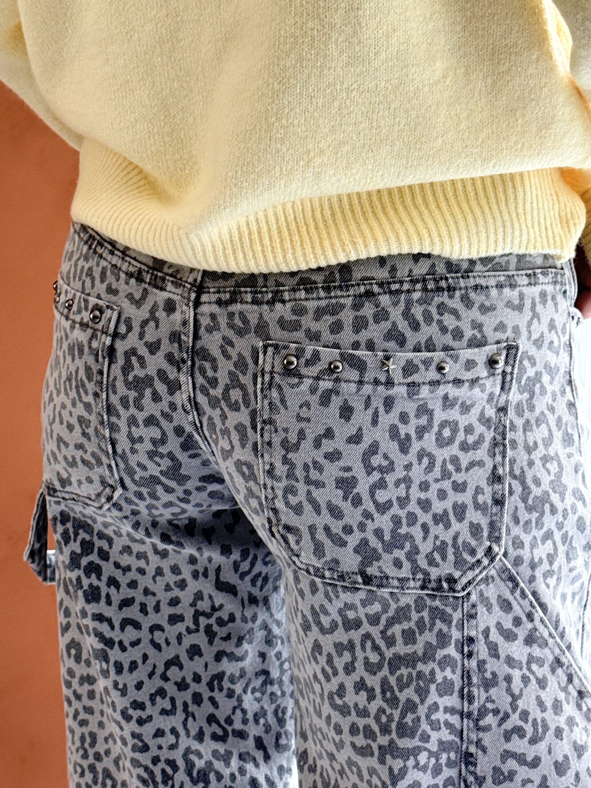 Pantalon barrel léopard gris avec petits clous au niveau de la ceinture
