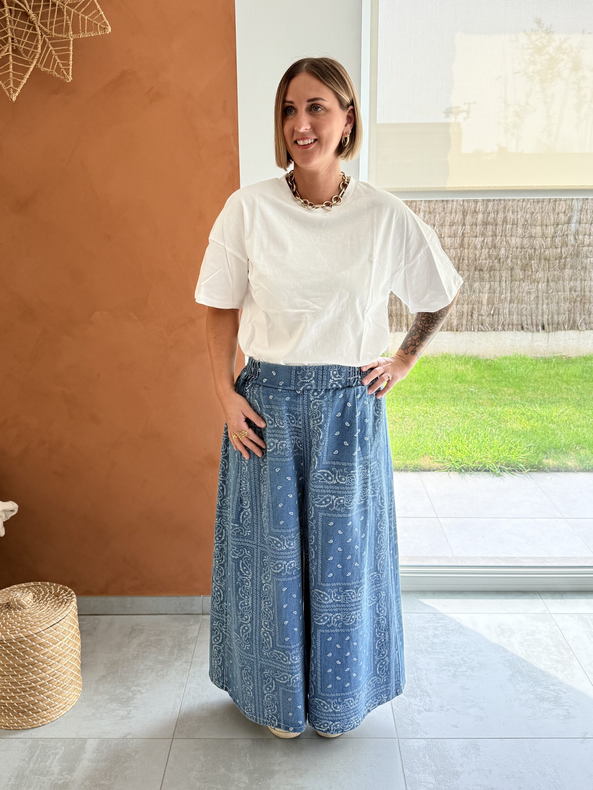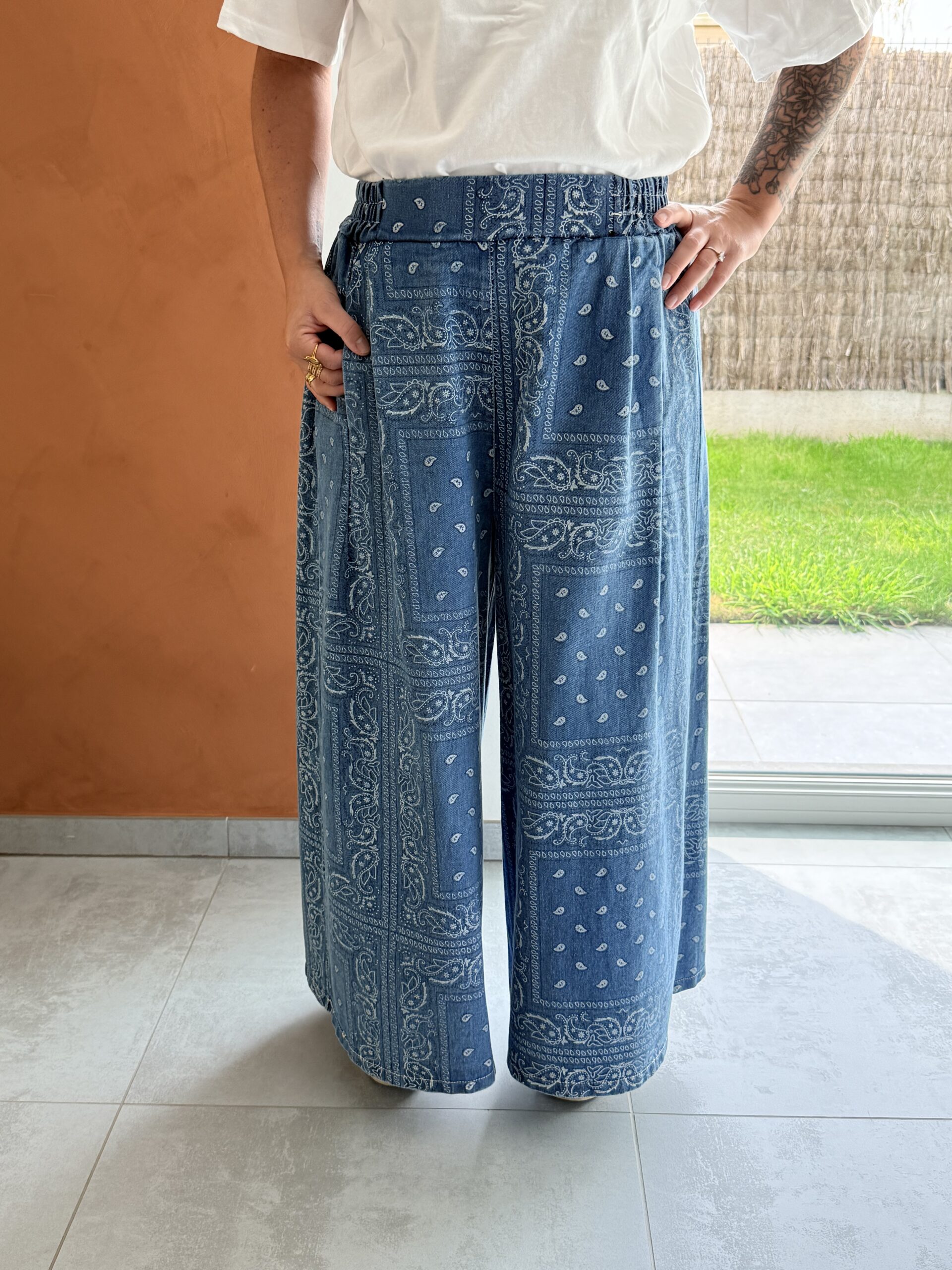 Pantalon large bleu effet bandana, élastique à la taille