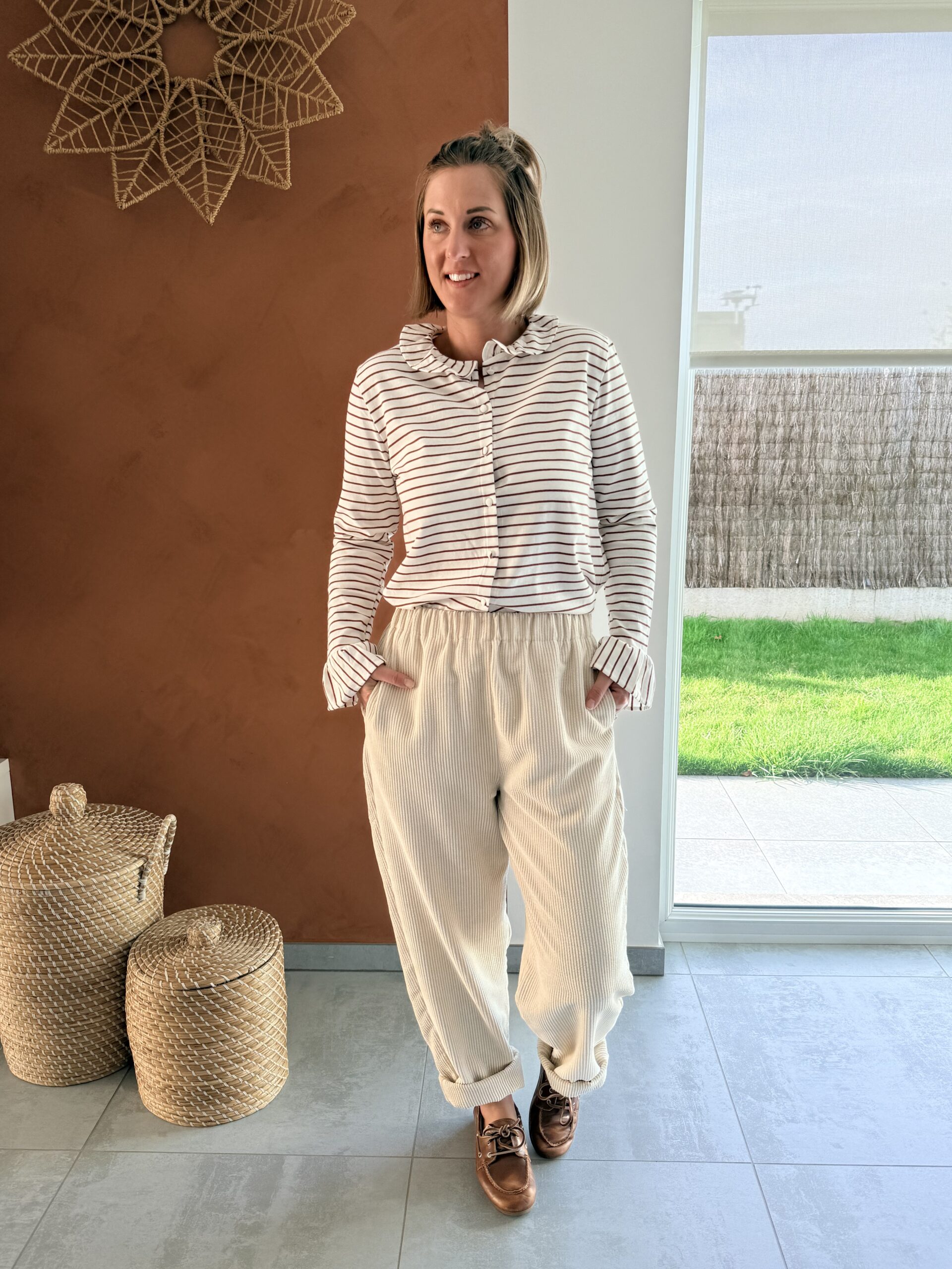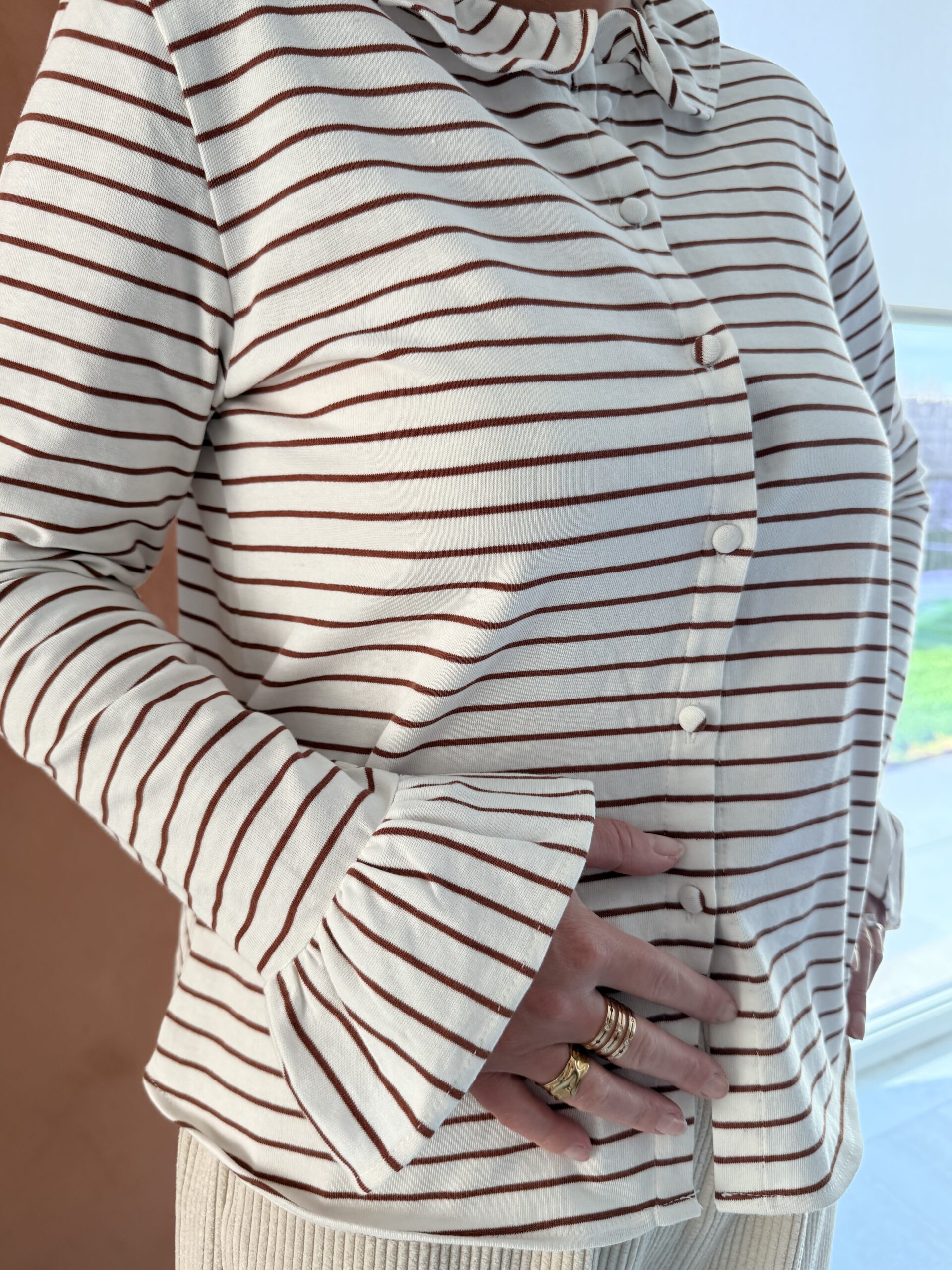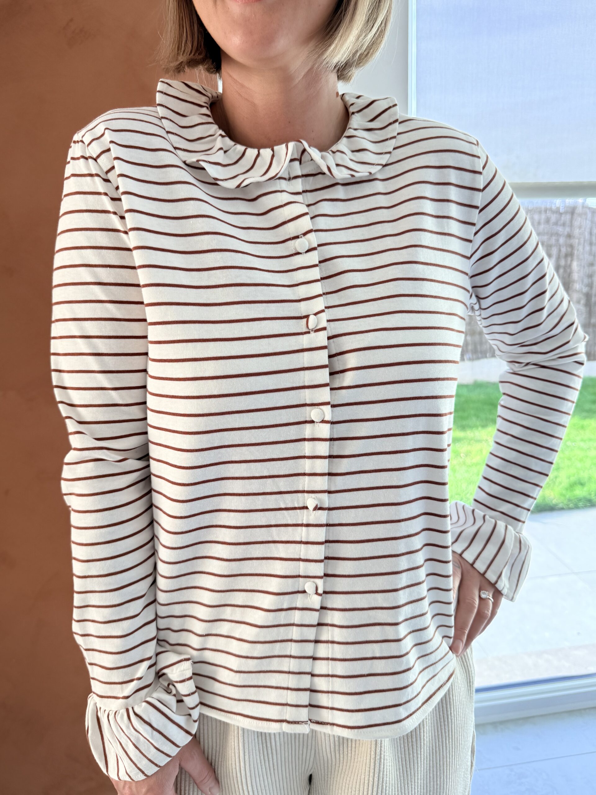 T-shirt blanc avec rayures de couleur café, manches volantes et petit col claudine