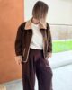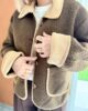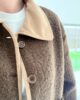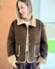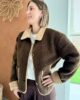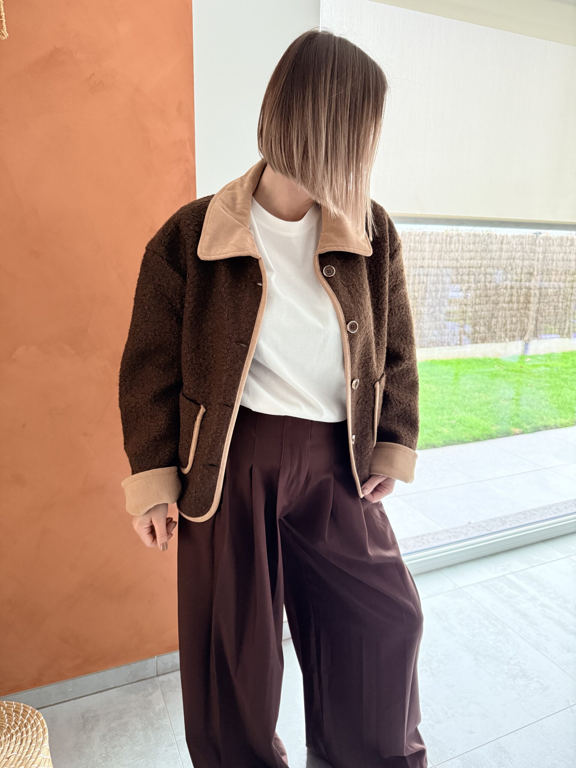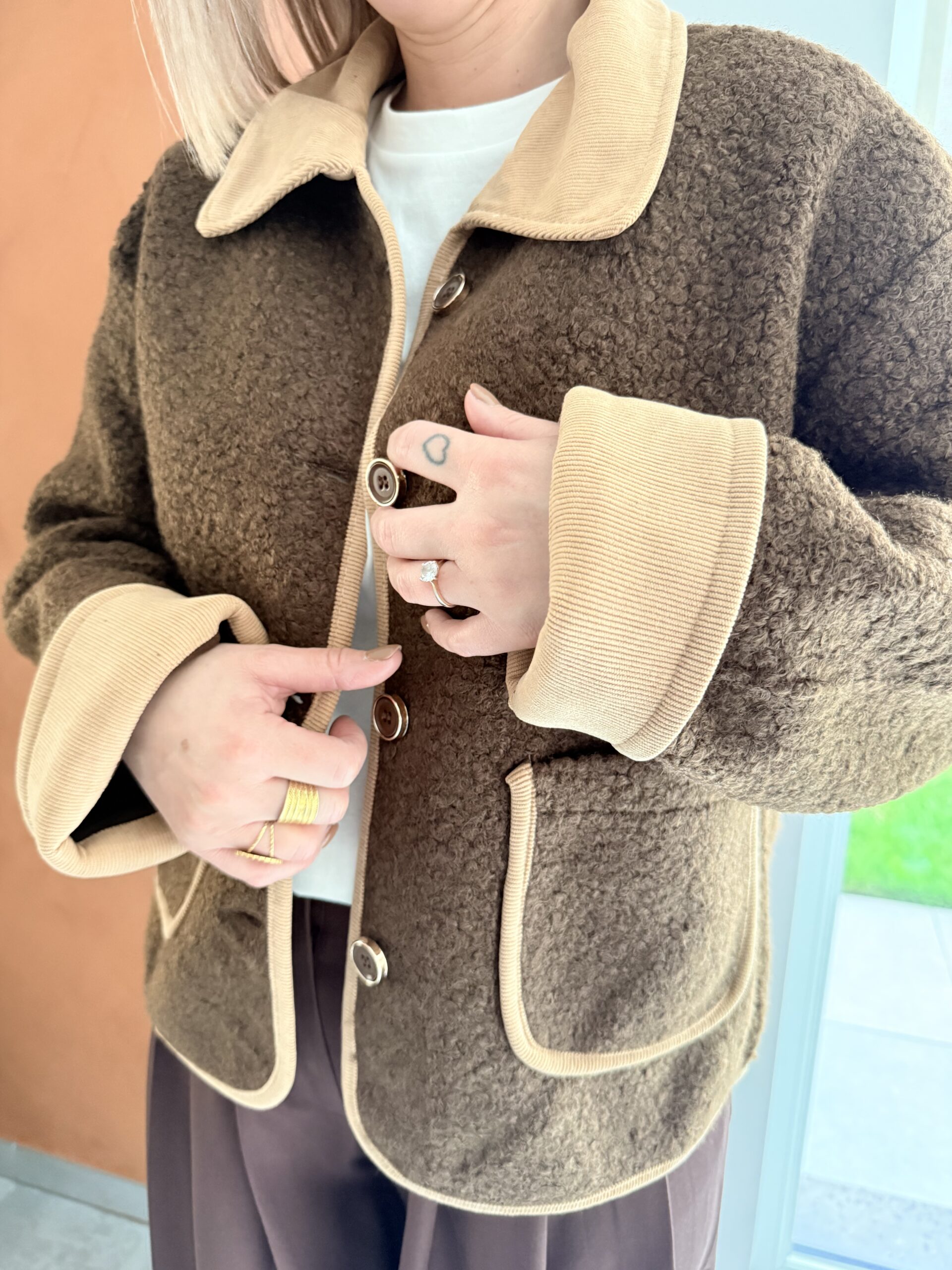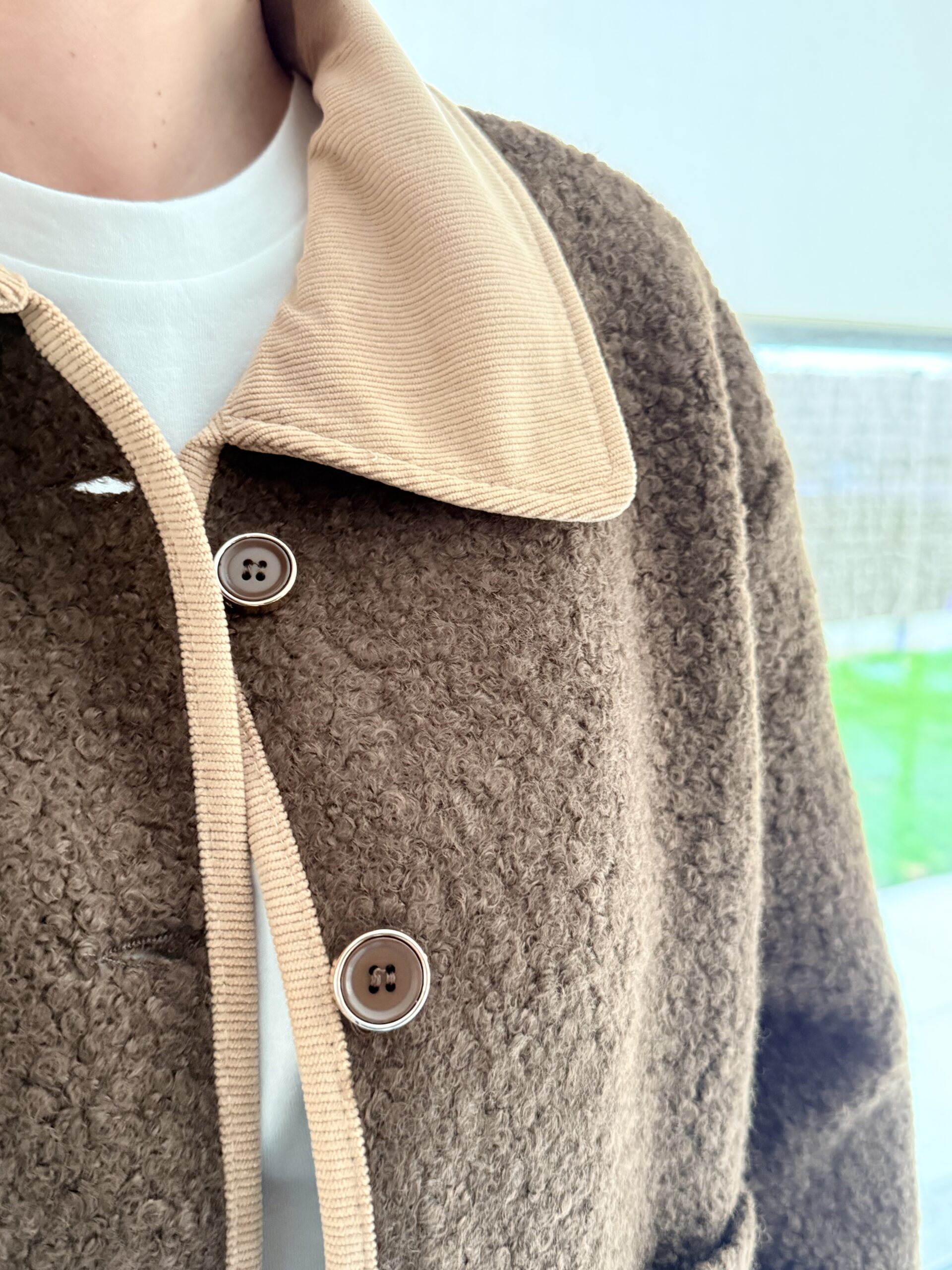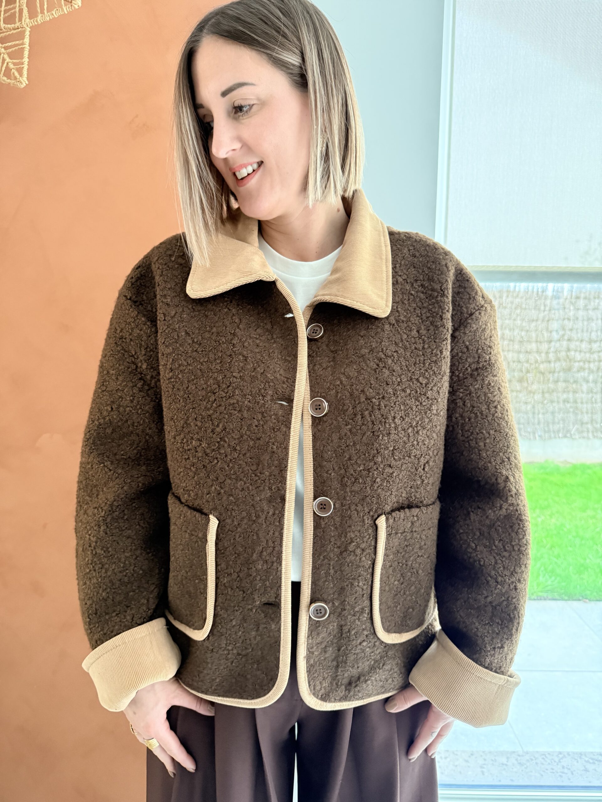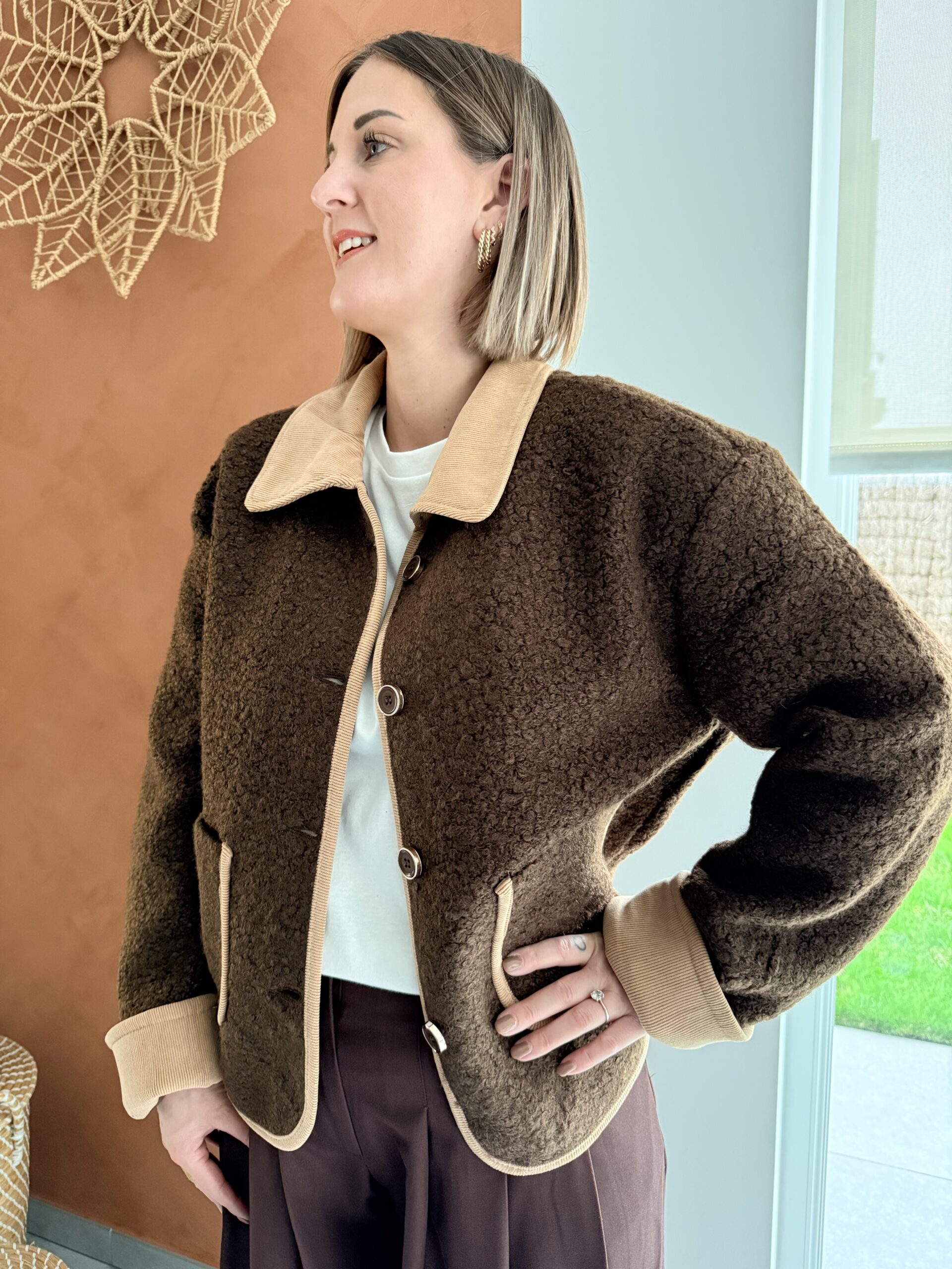 Veste courte camel en tissu bouclé et col en velours côtelé. Poches plaquées à l’avant. Bas droit et manches longues à revers contrastant. Taille assez grand